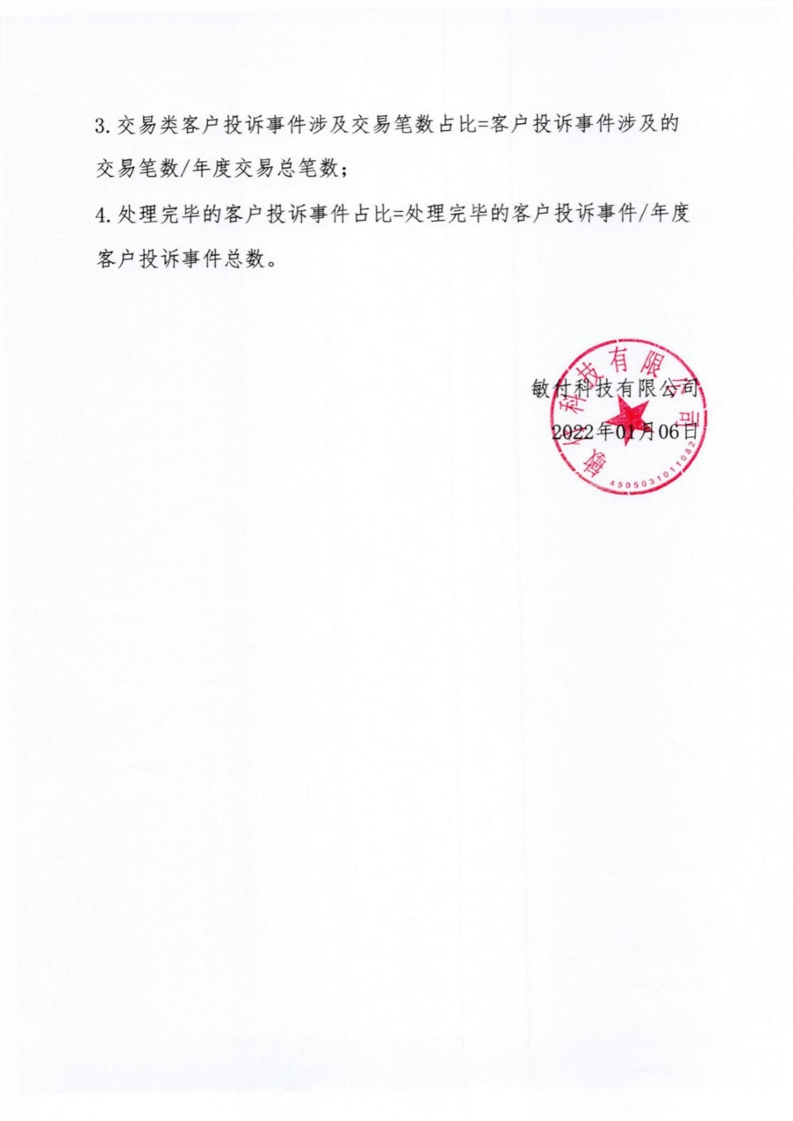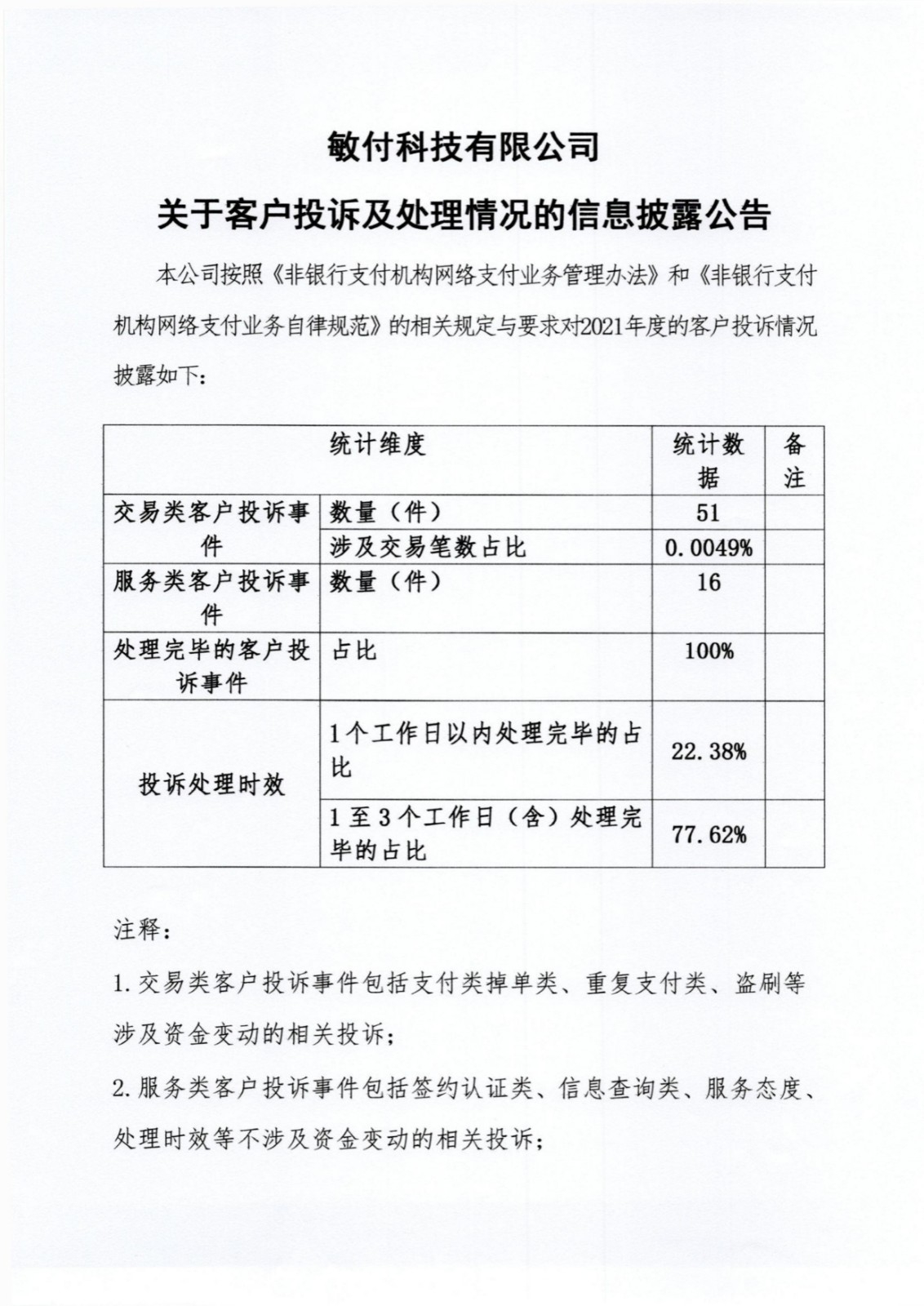 敏付科技有限公司关于客户投诉及处理情况的信息披露公告